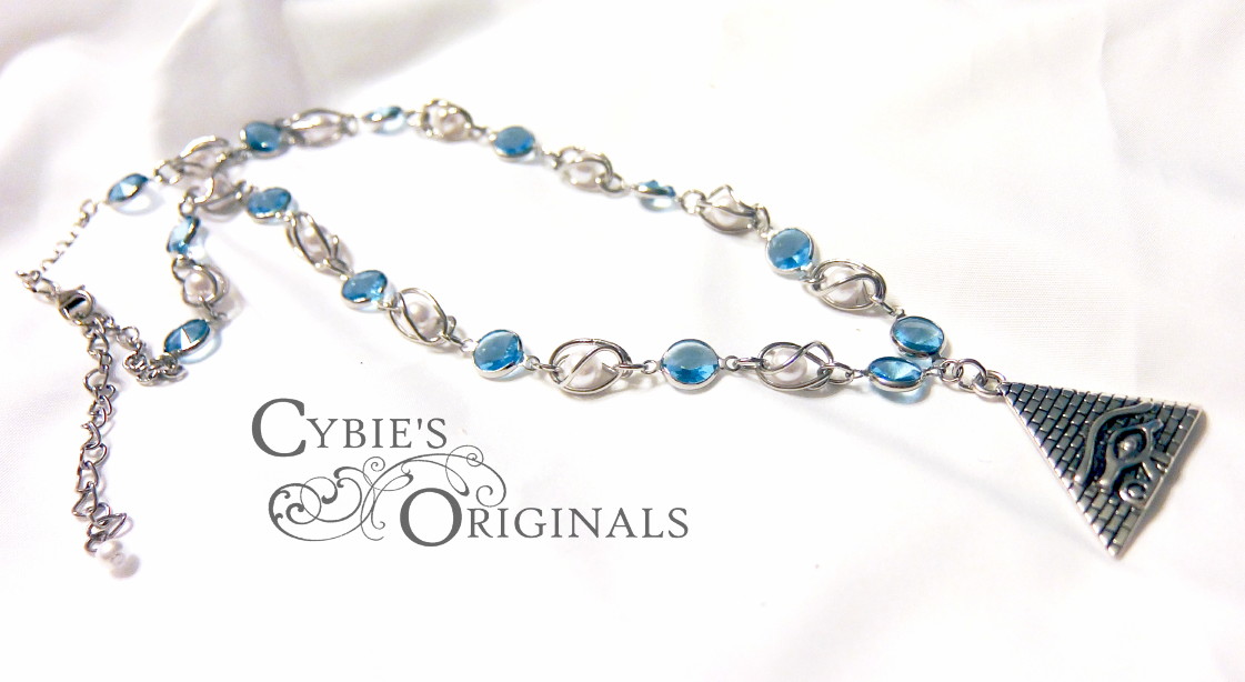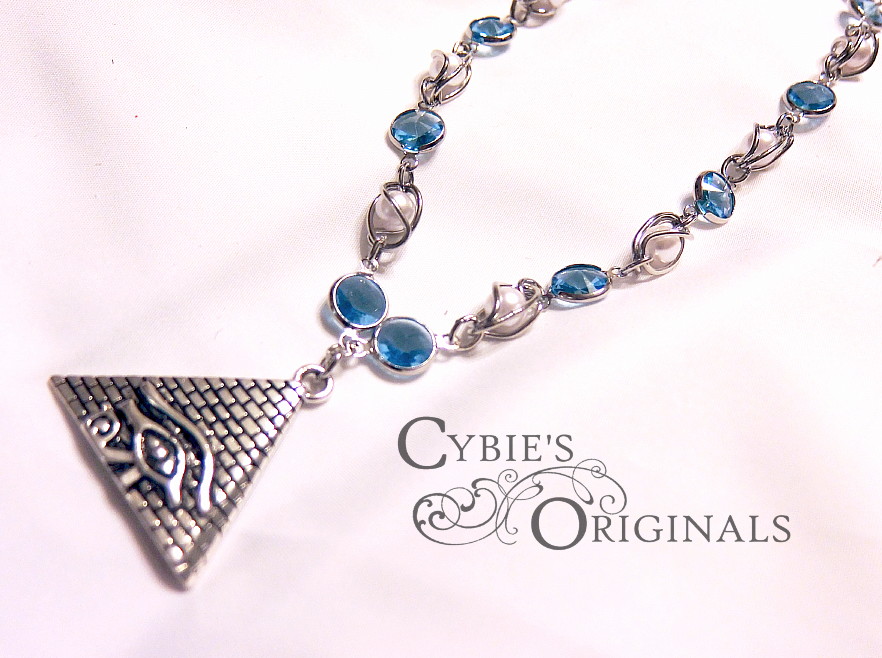 A silver Eye of Ra* center piece accompanied by caged white glass pears and light blue crystal accents.
