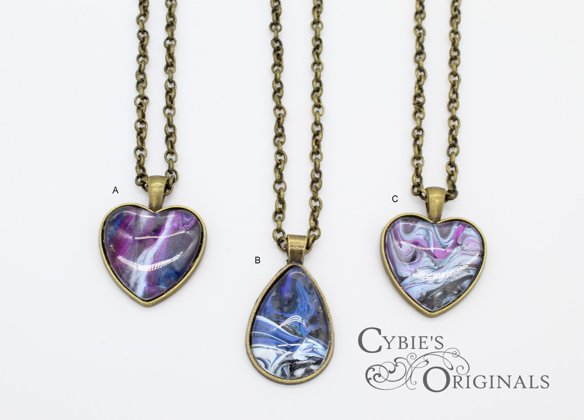 One of a kind Acrylic painted necklaces in a variety of shapes and colors. Antiqued gold setting with glass dome on a antiqued gold chain. Choose which one fits you best.