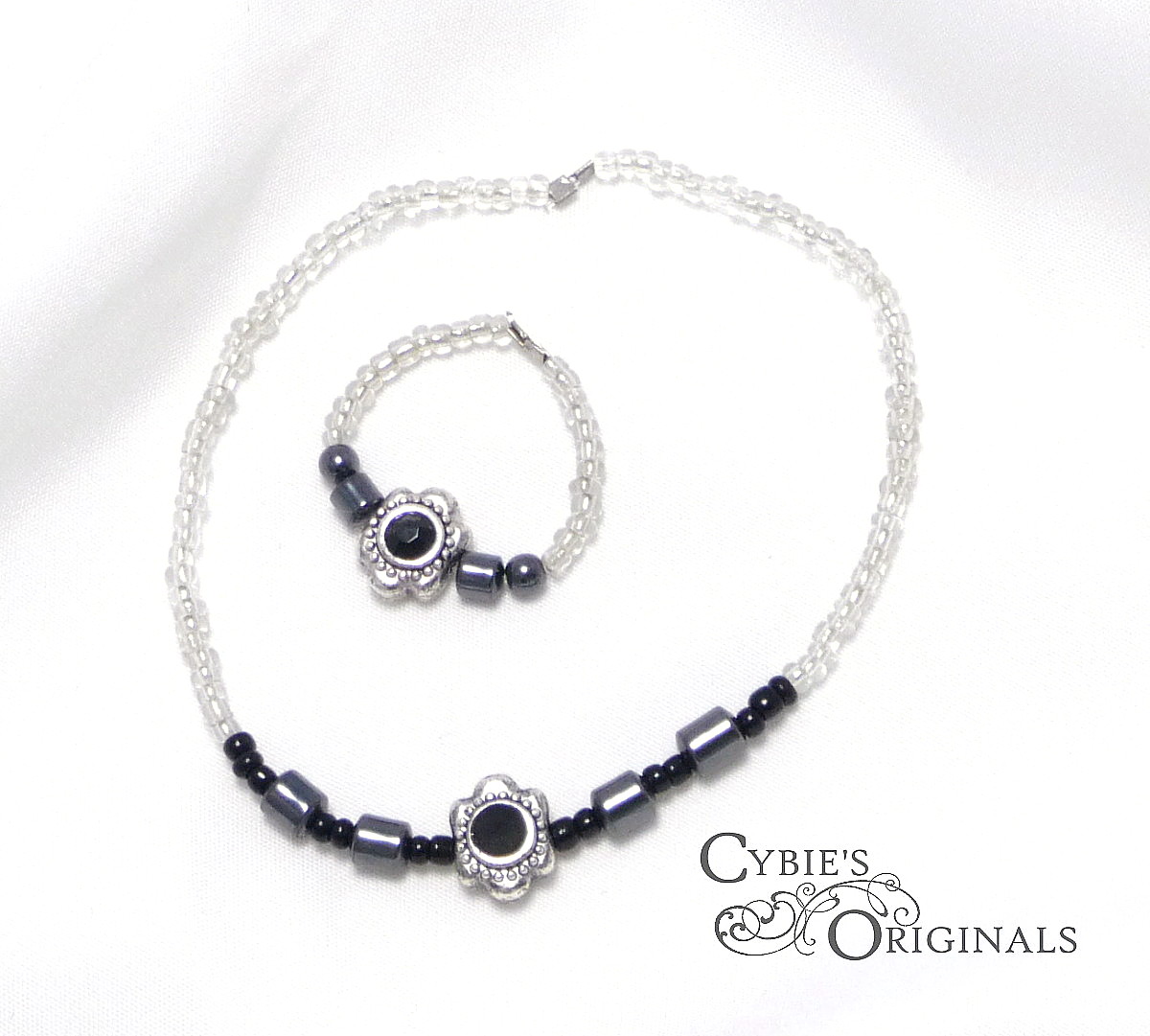 Hematite and decorative silver gem beads and glass seed beads all strung on stretch cord, Looks elegant when worn, but at an economic price.