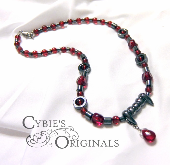 Like the dark, how about blood, vampires, werewolves, and fangs? Well this piece is for you. A simple drop of blood to get the attention of the person next to you. Dark gun metal grey with red crystal drop, accented with hematite semi precious gemstone, and red nugget glass beads.