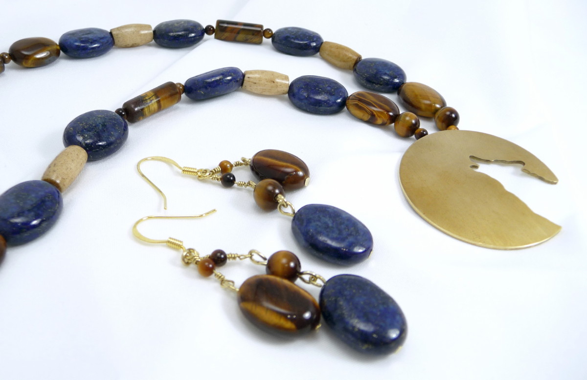 Hand cut brass pendant imported from Poland, accented with lapis and Tigereye