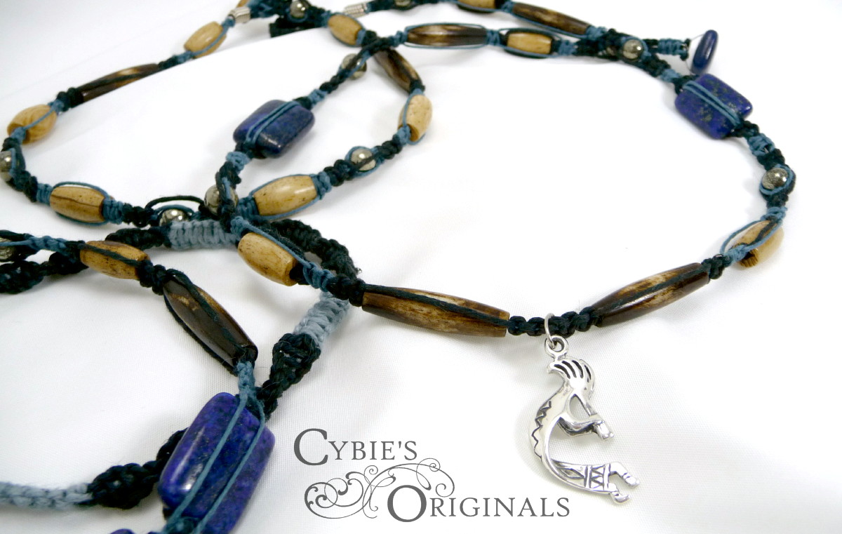 Necklace, double bracelet and single bracelet made with dark blue and black hemp accented with pyrite, bone and lapis with a silver kokopelli pendant.