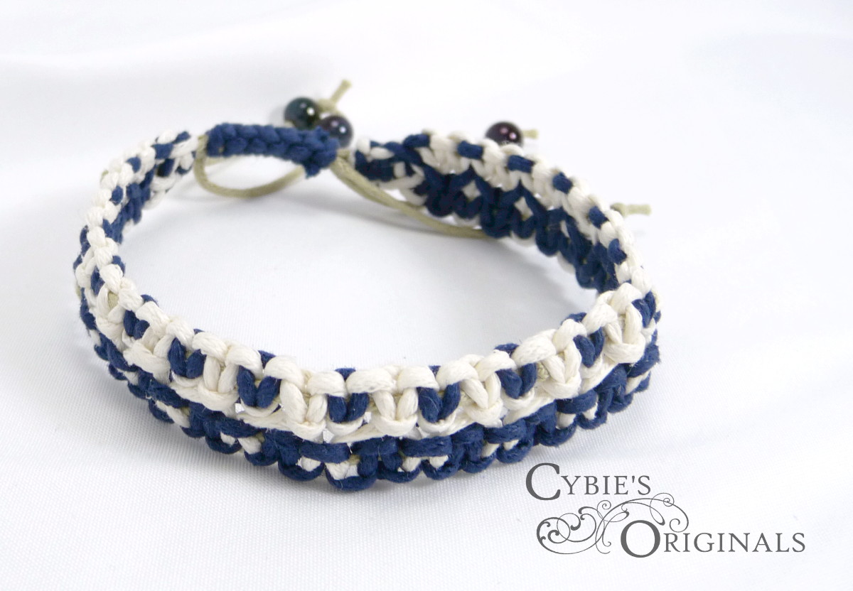 Blue and white hemp in a double knot bracelet