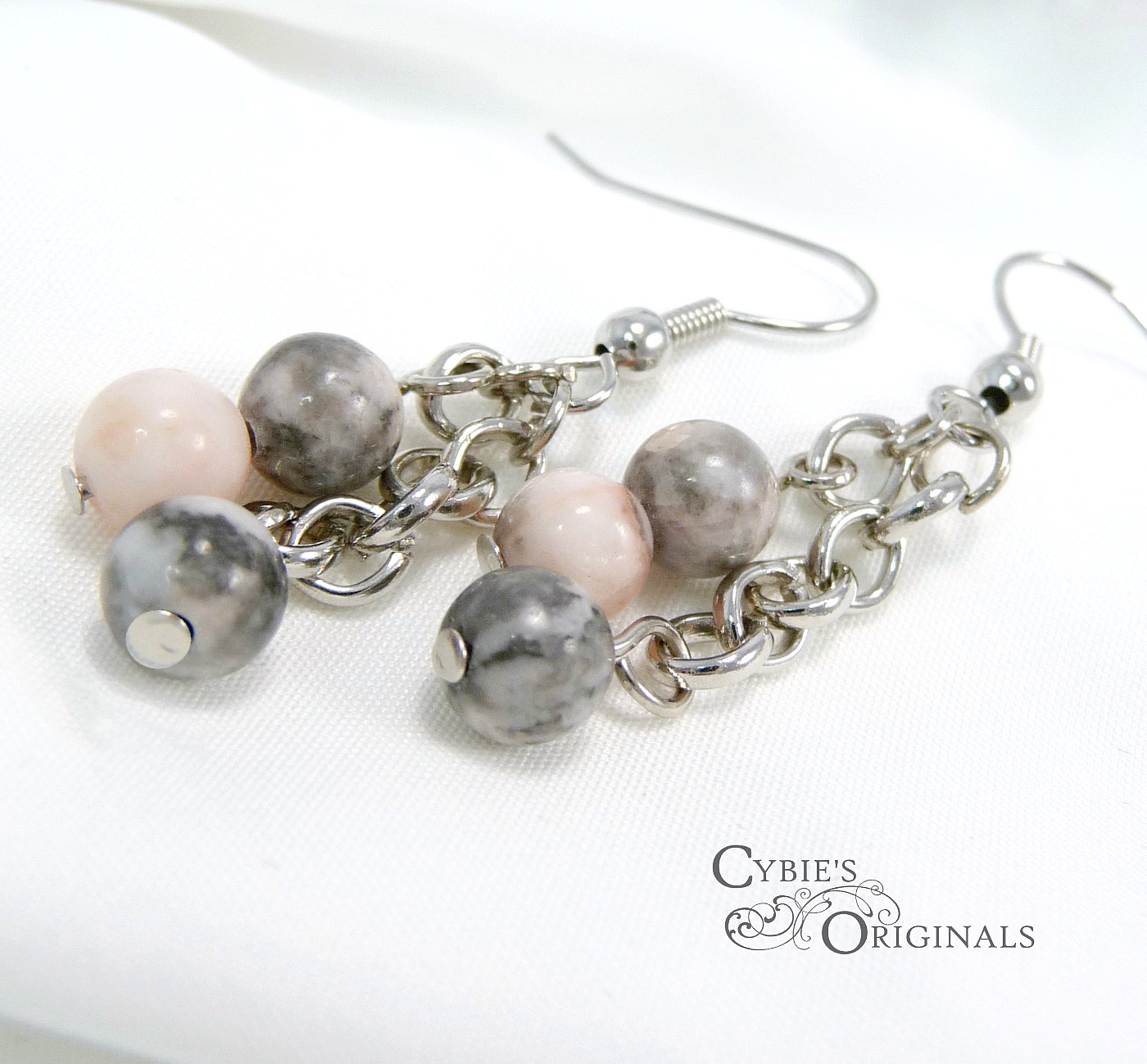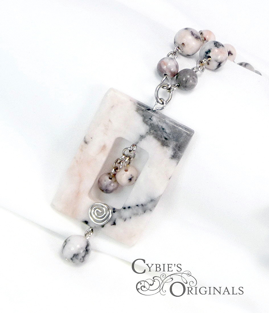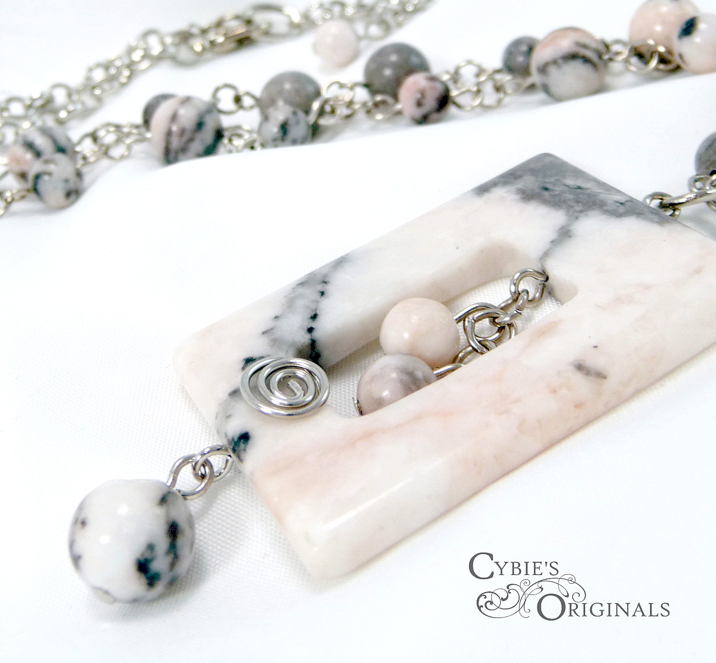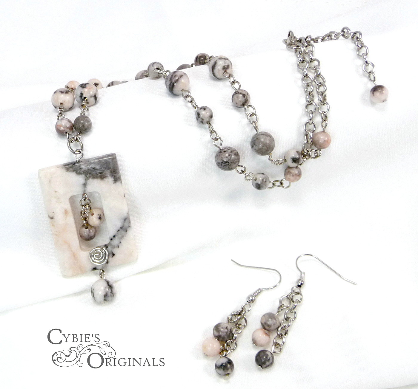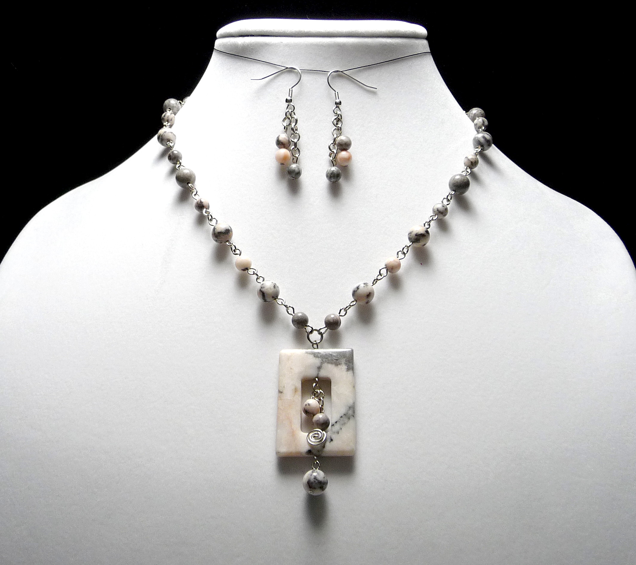 A necklace and earring set, made of pink zebra jasper semi-precious stone beads individually set to create a unique beaded chain. Pendant is accented with silver wired spiral wrap and matching dangling beads. Set includes a matching pair of dangle earrings. Necklace is 19 inches adjustable up to 21 inches.