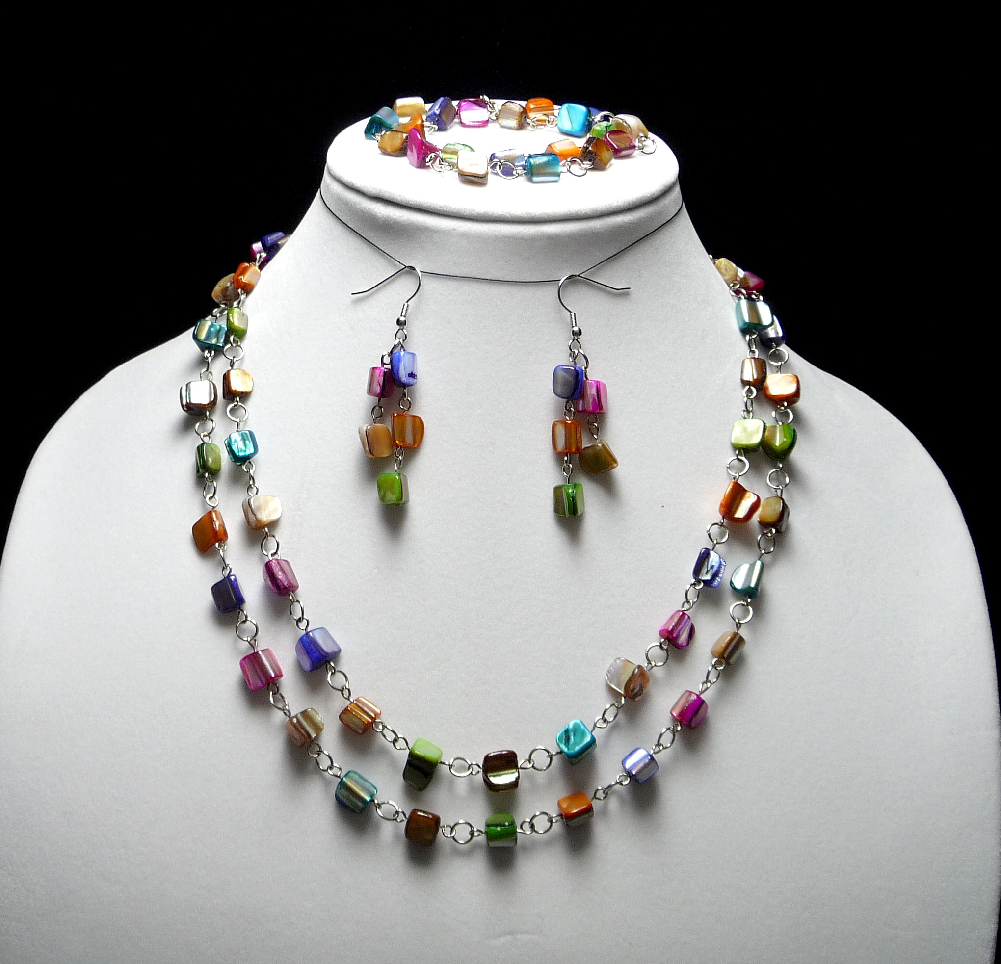 This is a three piece set. Necklace is a two strand and tiered with a handmade rainbow dyed mother of pearl beaded chain comprised of individually linked stones. Necklace measures 20" and comes with a matching double wrap bracelet and dangle earrings.