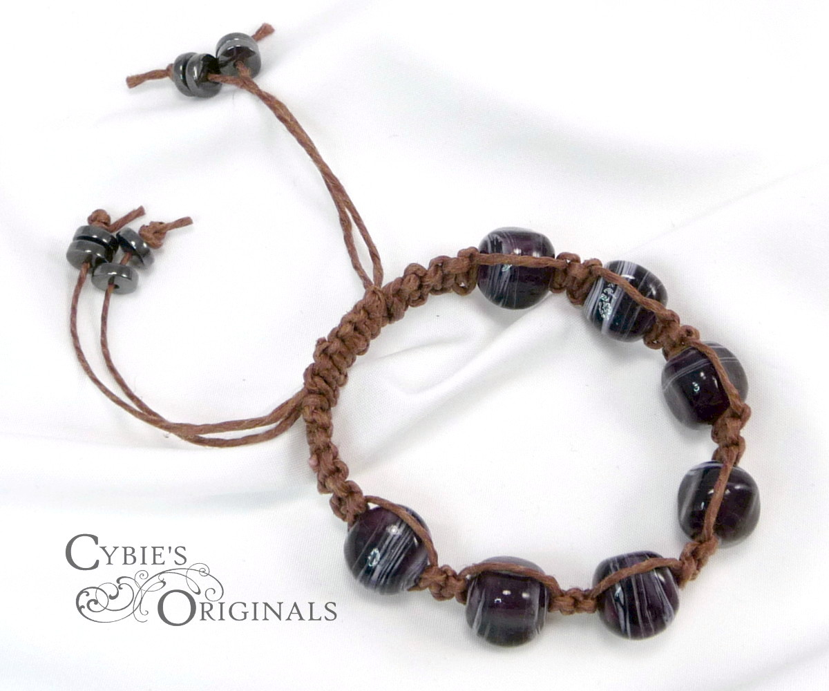 Swirly purple glass nugget beads and brown polished hemp macrame knotted bracelet. Great stacking bracelet.