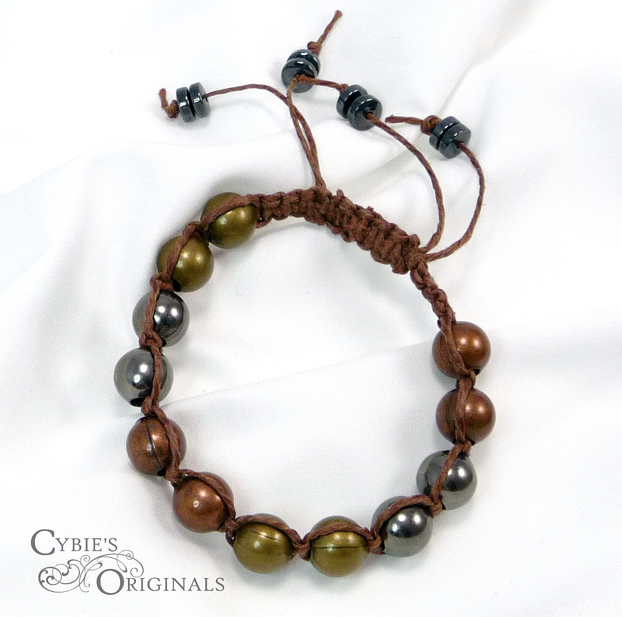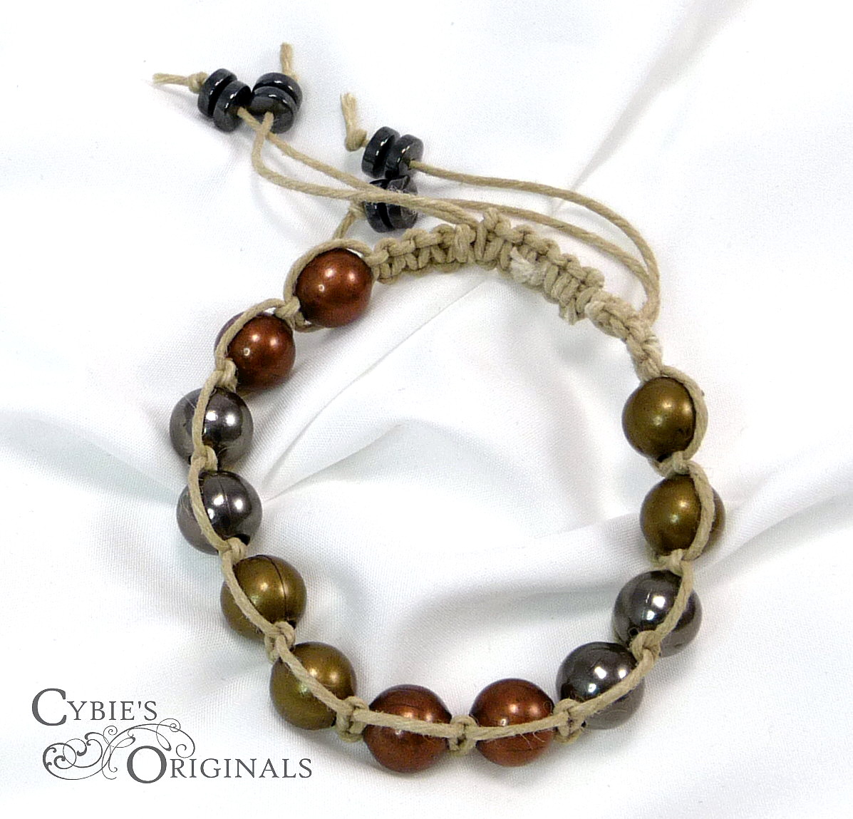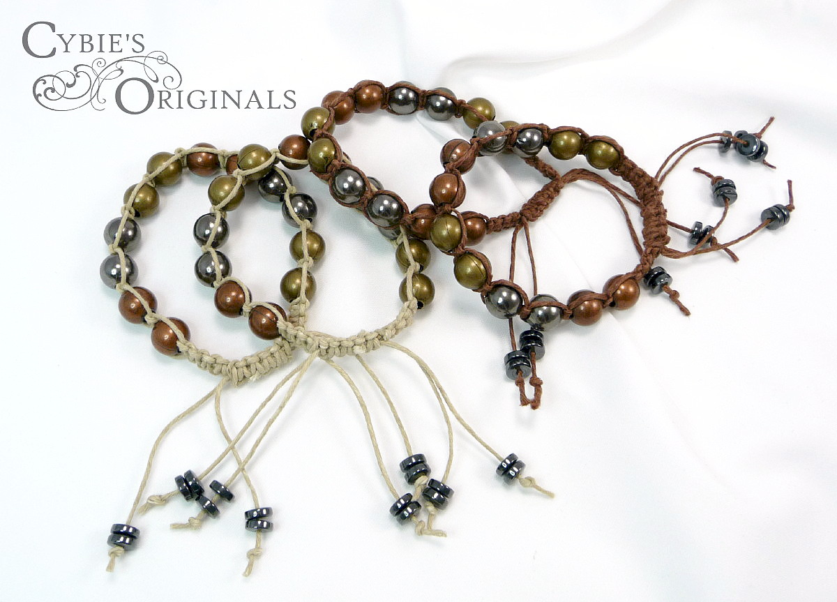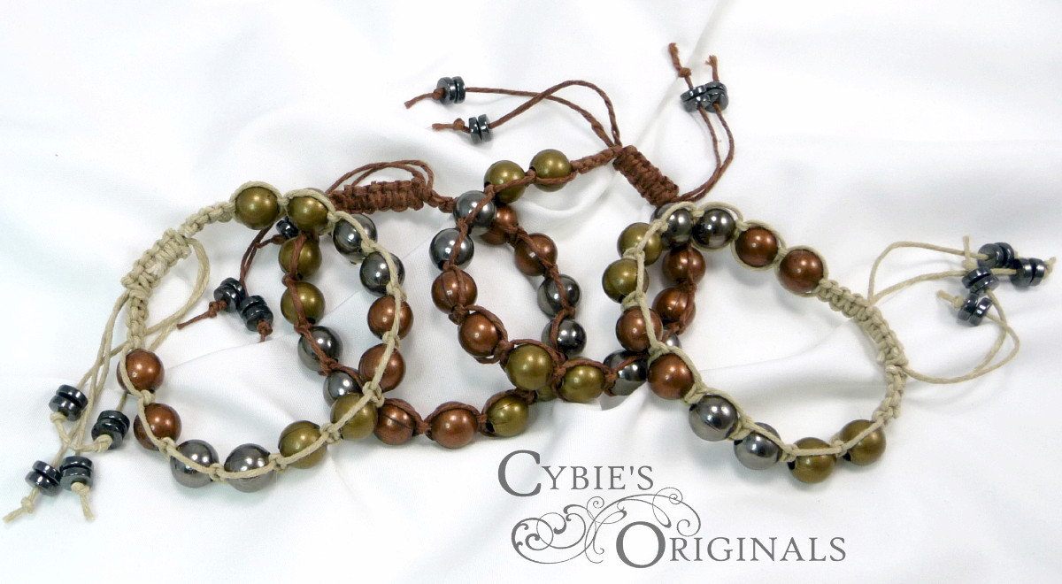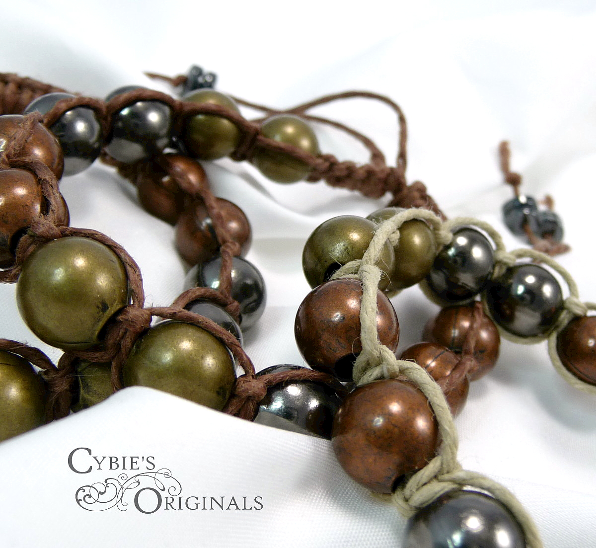 Heavy metal beads in 3 tones (aged bronze and copper, and gun metal) with brown or natural polished hemp cord. Macrame knotted bracelets. Great stacking bracelets!