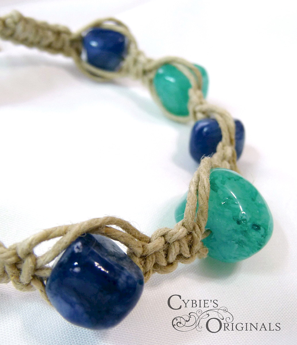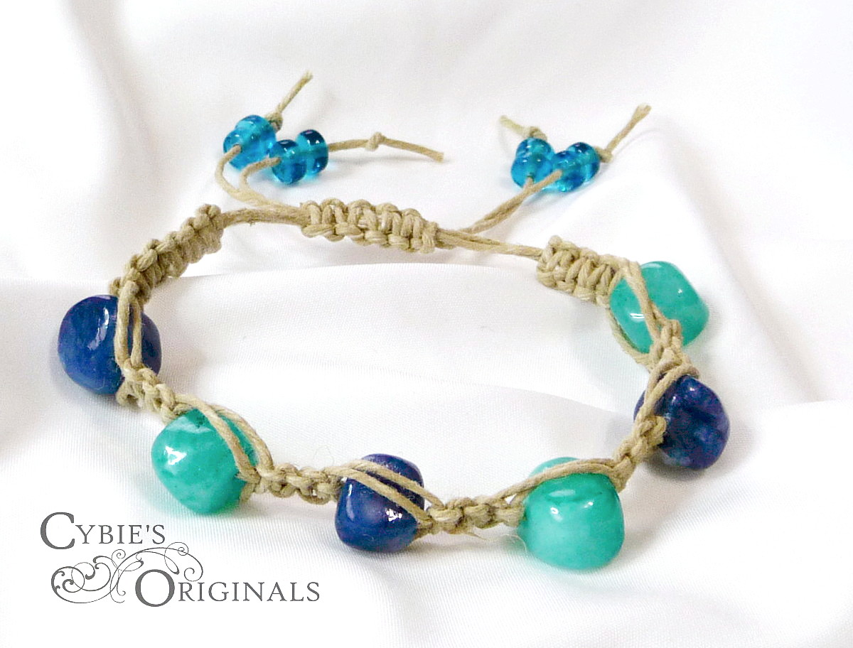 Light and dark blue glass nugget beads and natural polished hemp macrame knotted bracelet. Great stacking bracelet.