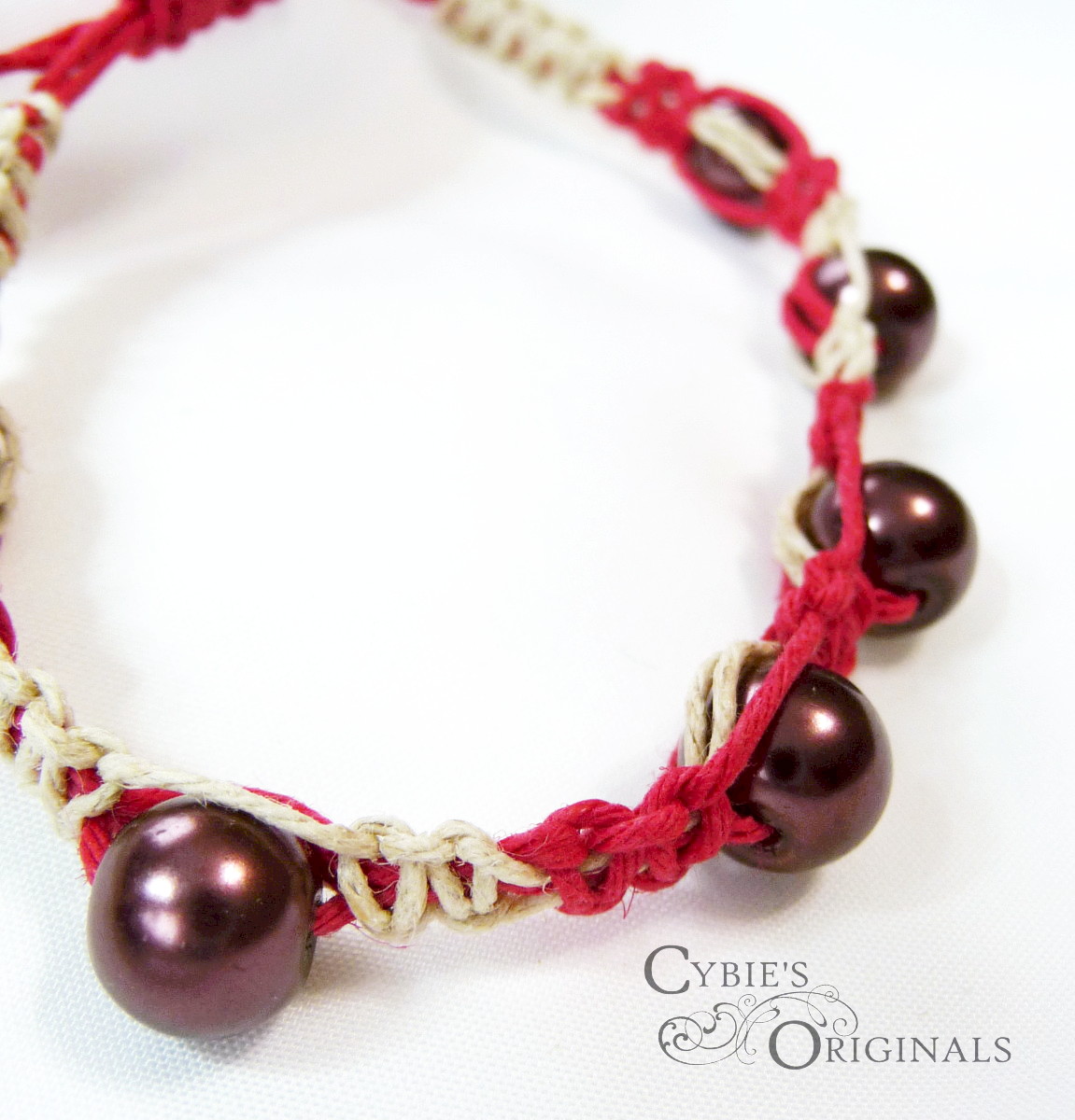 Red glass pearls on polished natural and dyed hemp. Macrame knotted bracelet. Great stacking bracelet.