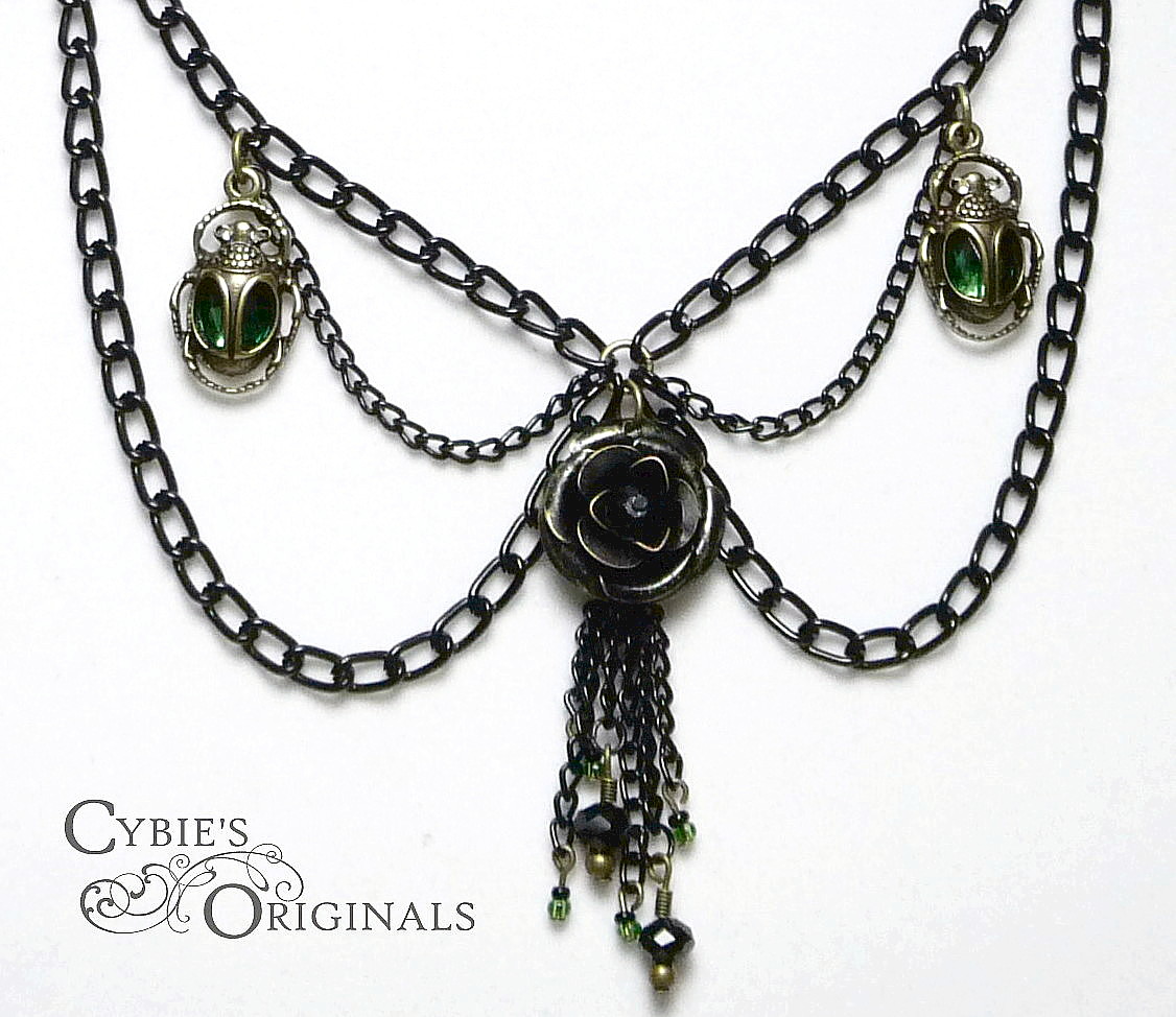 Light weight black metal chain with a tarnished rose with two emerald like crystal gems encased inside of golden scarabs on either side. The matching earrings are roses made of hand dyed material.