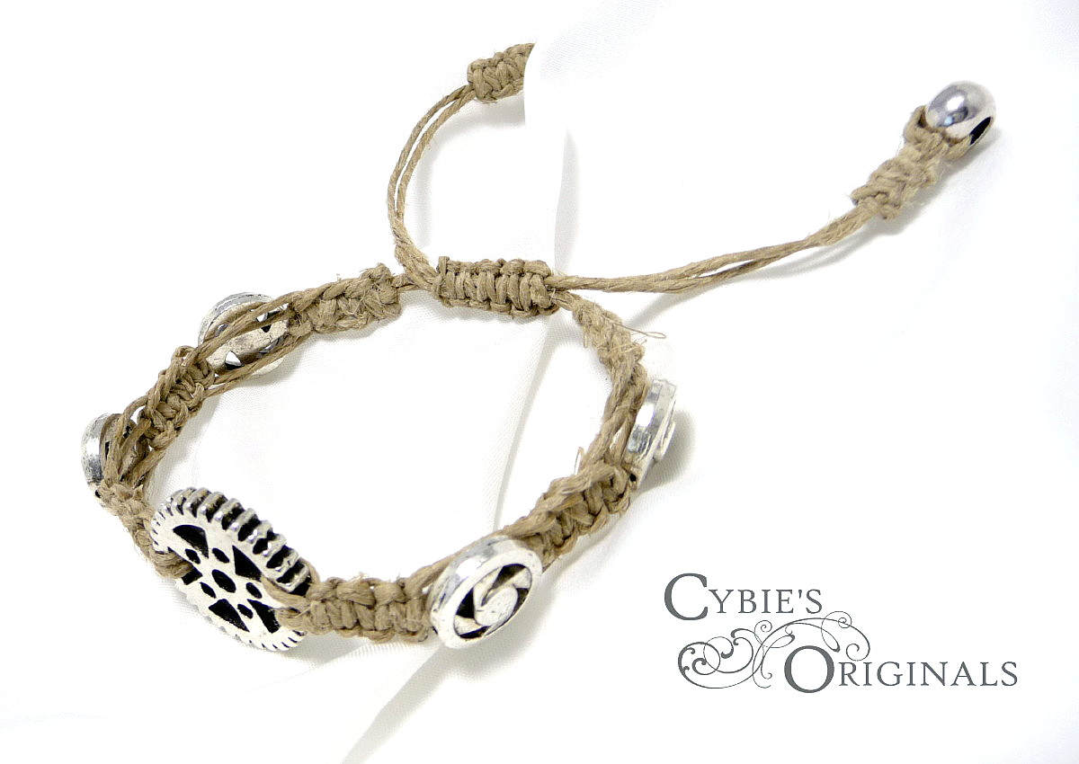 Silver metal gear beads and polished natural hemp macrame knotted bracelet. Great stacking bracelet.