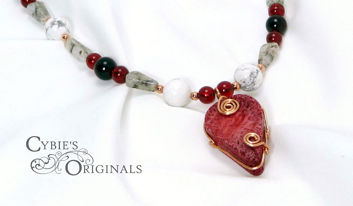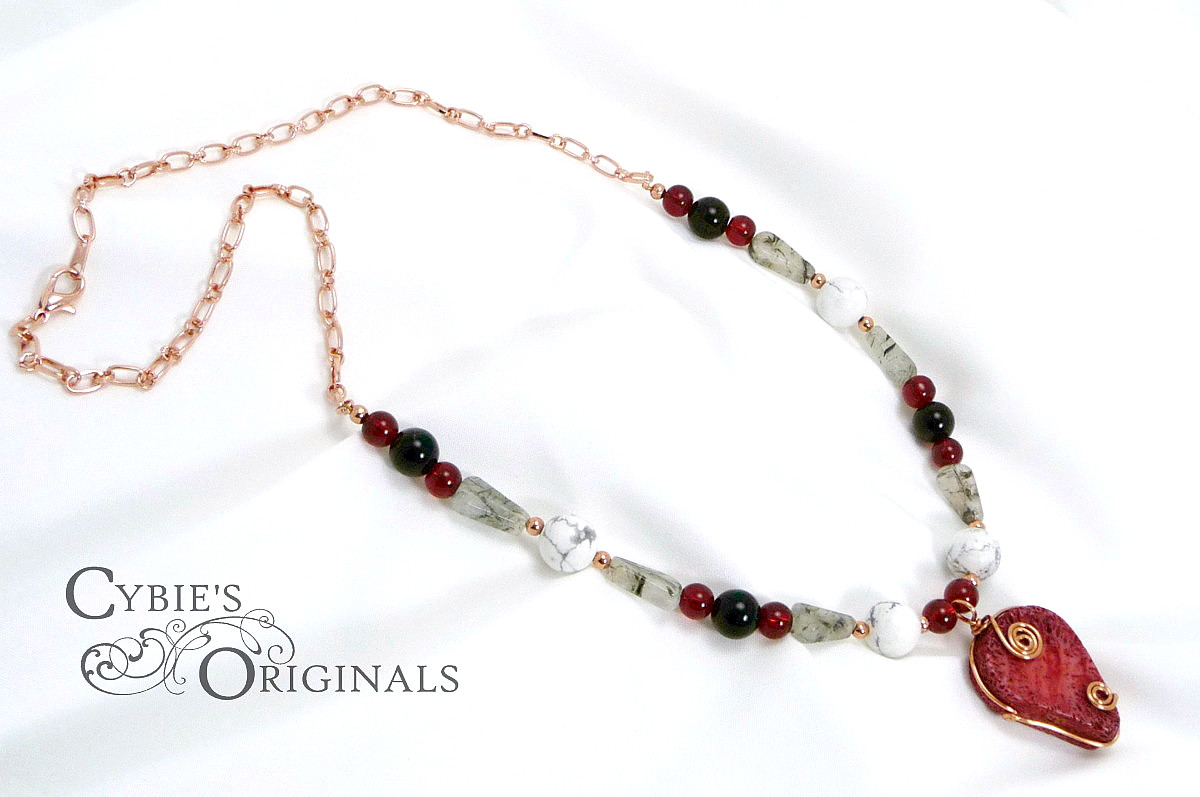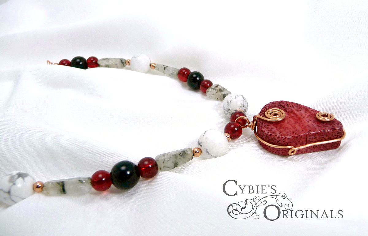 Uniquely cut red sponge coral focal hand wrapped with copper wire, accented with semi-precious Howlite, black agate, tourmalinated quartz stones, red glass and small copper beads.