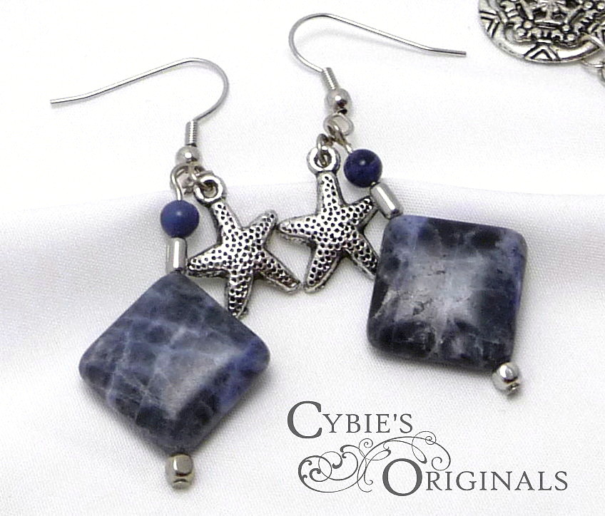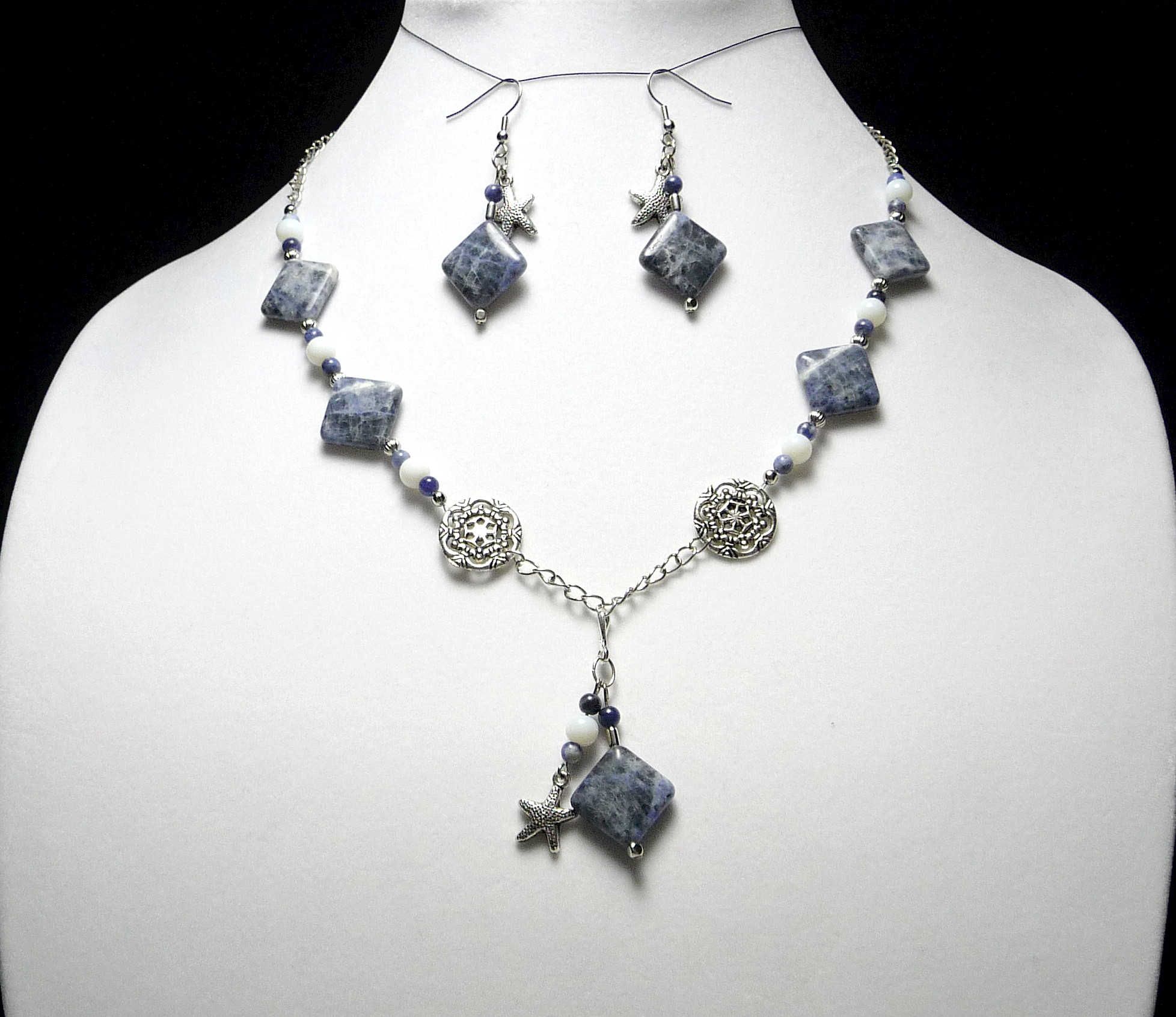 Semi-precious Sodalite gemstone beads, accented by white glass beads and silver starfish. Includes matching earrings.