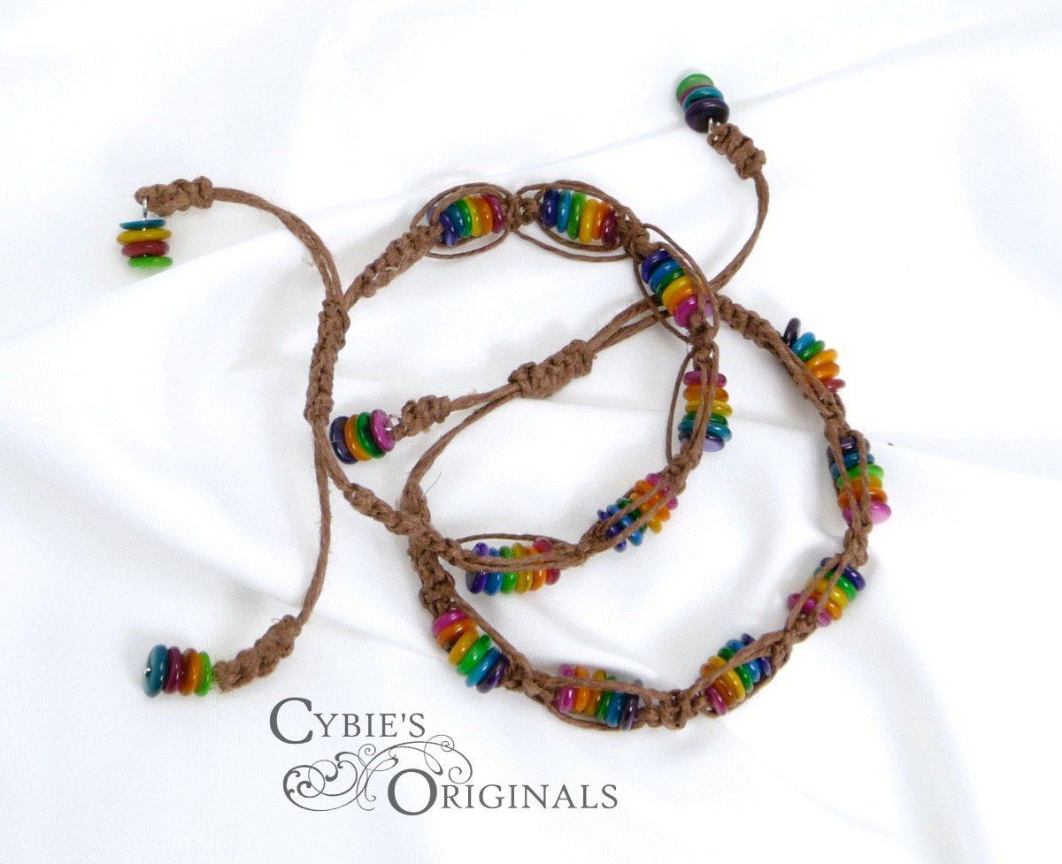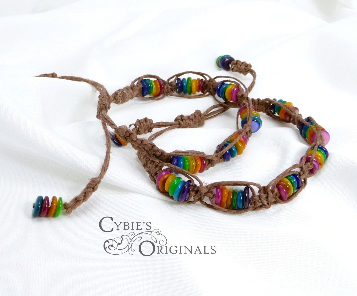 A pair of macrame knotted bracelets made using dyed mother of pearl beads in rainbow colors and brown polished hemp.