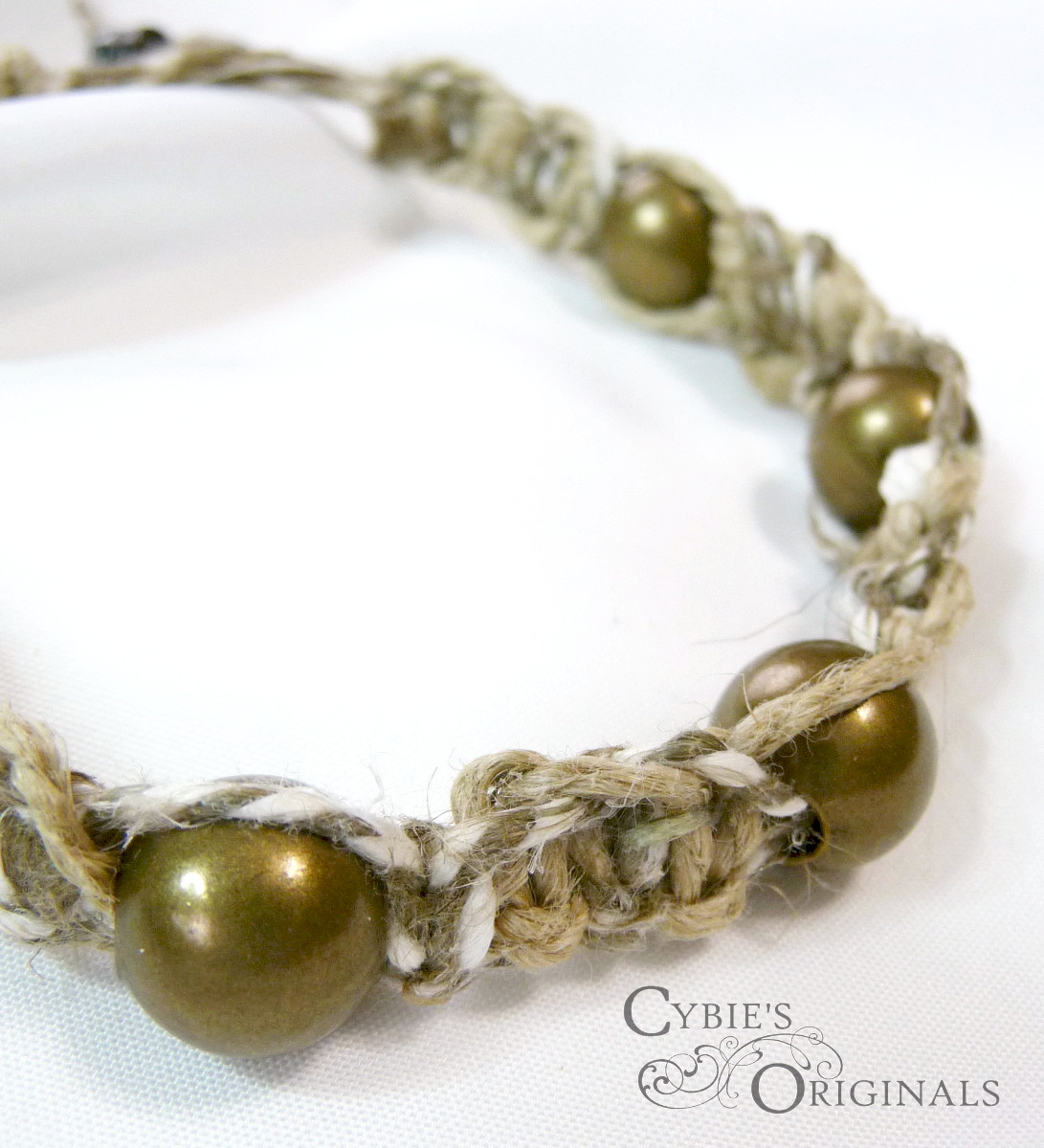Heavy metal beads in aged bronze on natural and striped hemp. Macrame knotted bracelet.