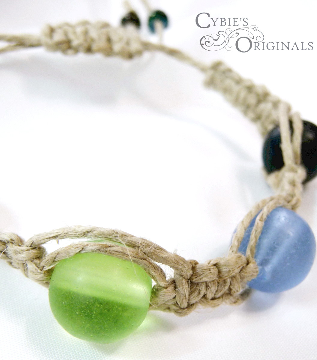 Quality frosted glass beads and natural hemp macrame knotted bracelet. Great stacking bracelet.