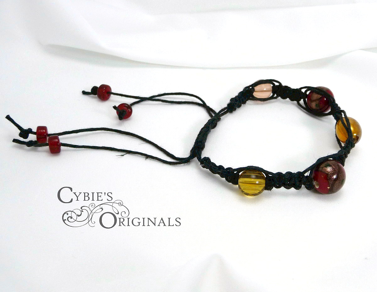 Red and gold glass beads in a black hemp macrame knotted bracelet. Great stacking bracelet.
