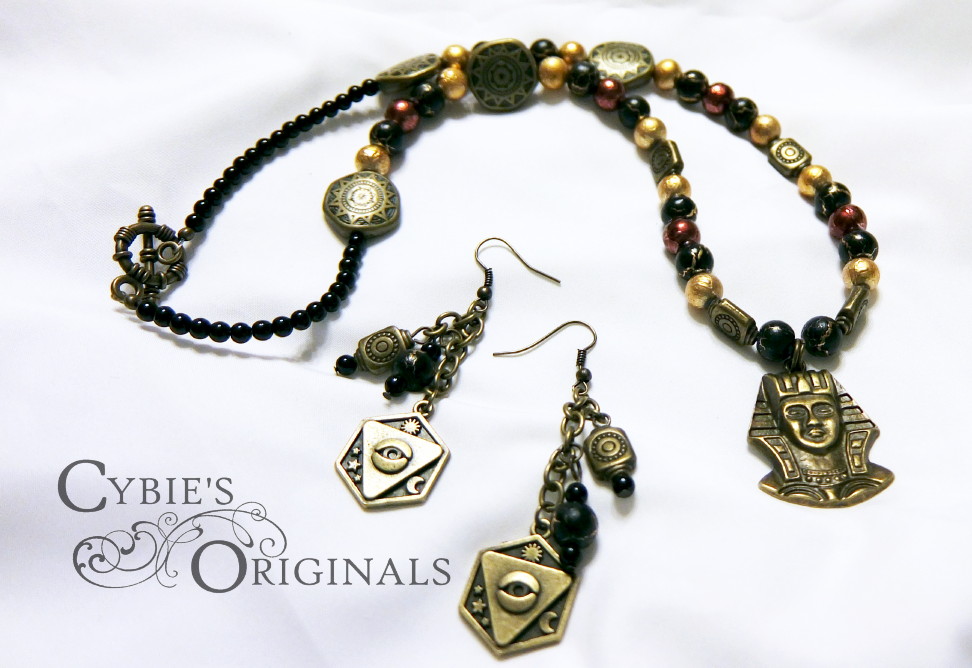 The Egyptian Crown is a well known image to many as a symbol of strength. This antiqued golden centerpiece is accented with antiqued golden beads and black, gold, and red crackled glass beads. Paired with a unique set of earrings following the Egyptian theme.