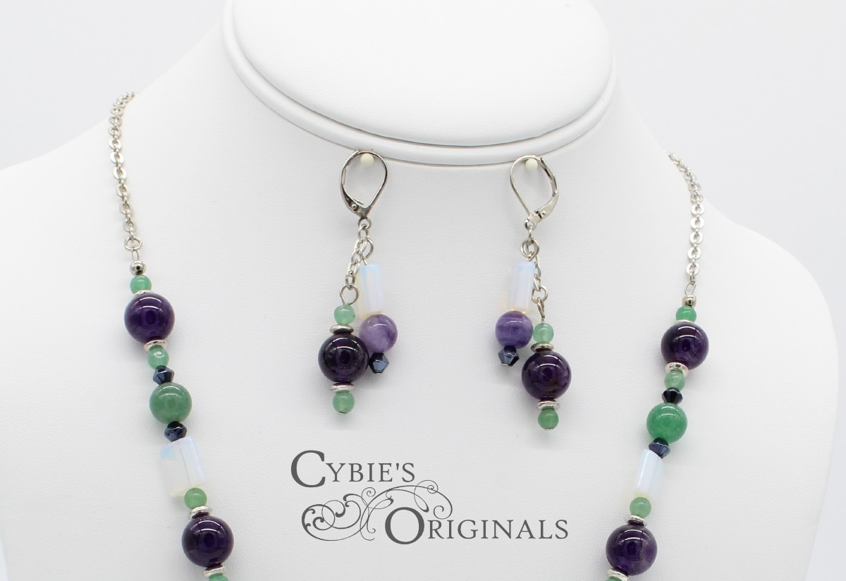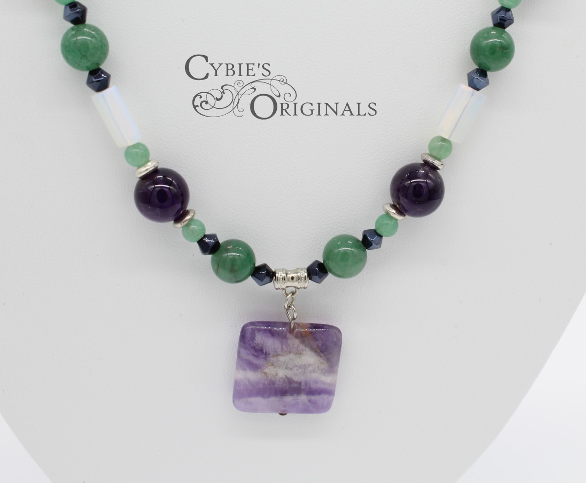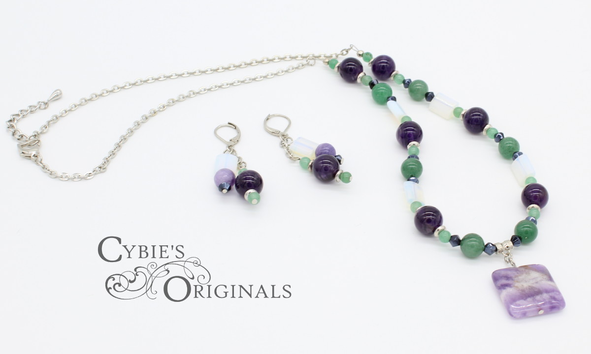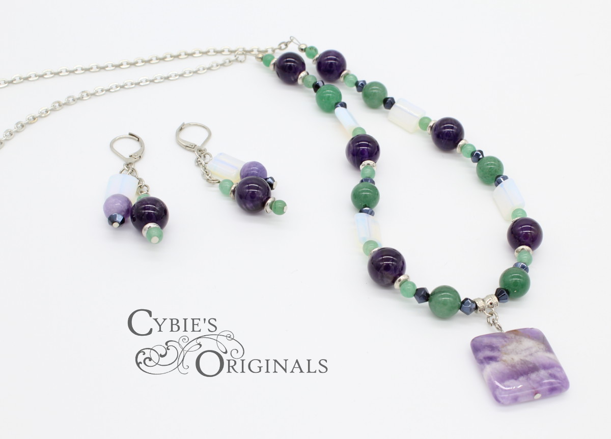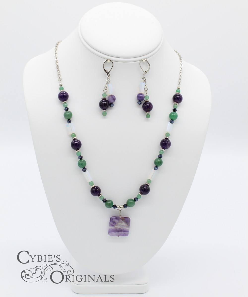 Unique square amethyst pendant accented with beautiful semi precious amethyst, adventurine, and moonstone. Includes matching earrings.