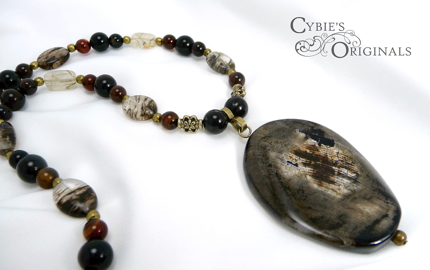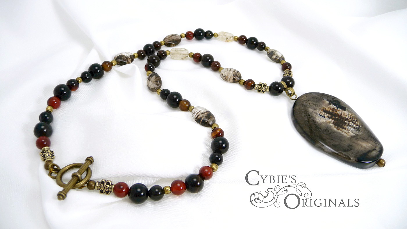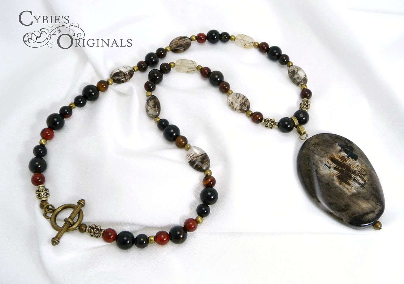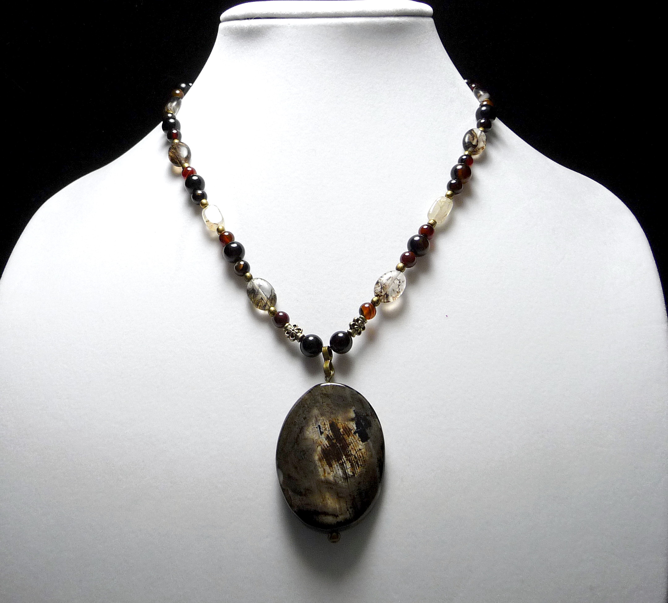 Unique semi-precious silver leaf jasper pendant on a beaded strand of black and red agate with tourmilated and rutilate quartz accents.